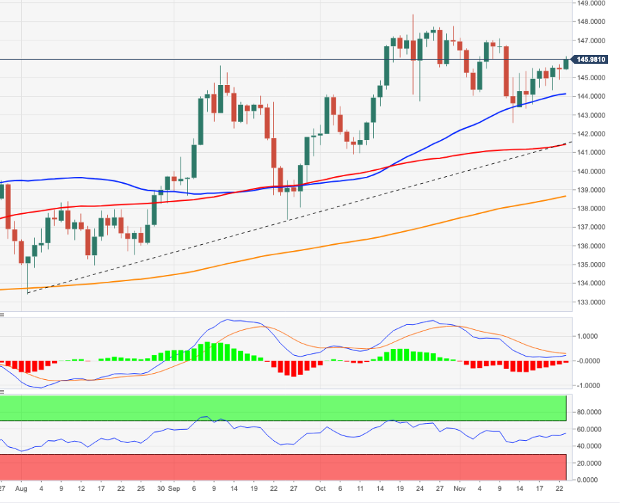 到目前為止,修正反弹看起来维持良好,该交叉盘应该会在截至目前的11月高位147.11(11月9日)处面临初步阻力。在后者之上,可能会打𫔭看向2022年的峰值148.40(10月21日)的大门。