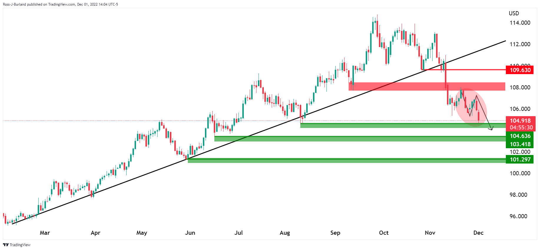 美元指数正测试进入104区域的中段,该区域阻止汇价下跌103和101关口。