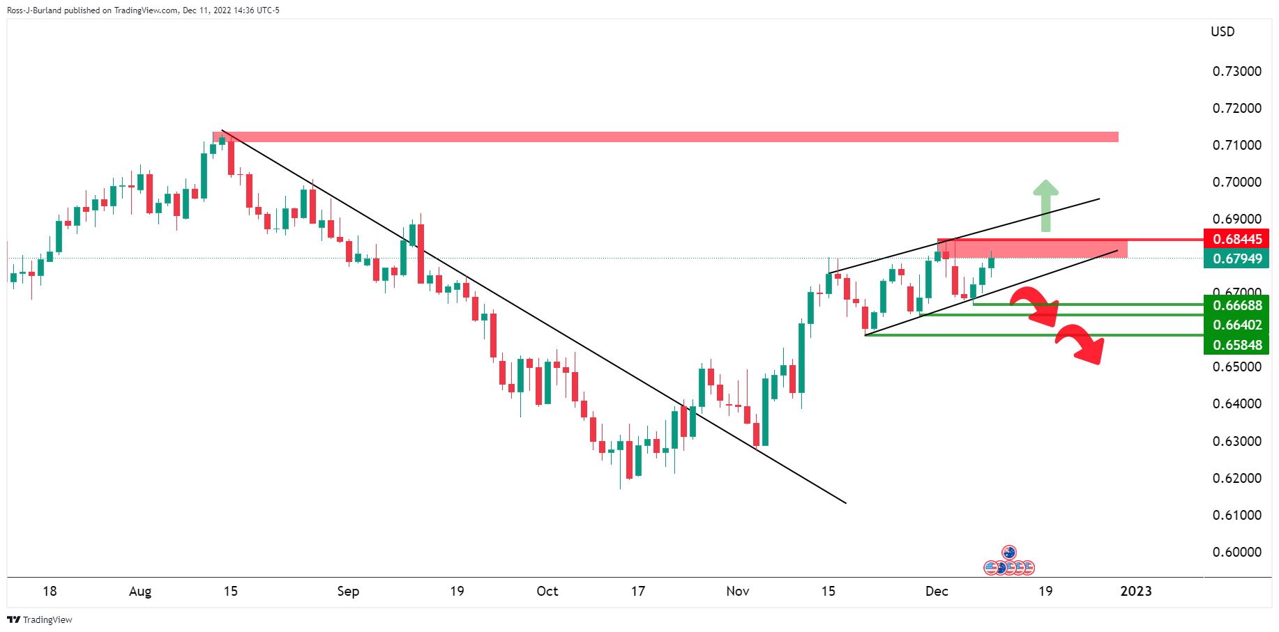- 然而,若澳元/美元跌破0.6750,则将𫔭啟进一步波动的风险,以测试0.6700附近的看涨动能。
