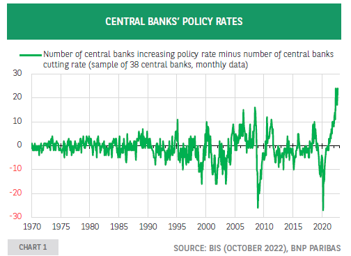 如今,这个概念已经进入了央行的世界。美联储(fed)副主席莱尔•布雷纳德(Lael Brainard)在最近的一次演讲中指出,“全球同时收紧政策的综合效应大于各部分的叠加效应。 ”同步加息的次数确实异常之高(见图表)。考虑到许多国家正遭受高通胀之苦,这并不令人意外。根据布雷纳德的说法,这迫使美联储“考虑到利率上升、美元走强和外国经济体对美国需求减弱的溢出效应,以及反向影响”。