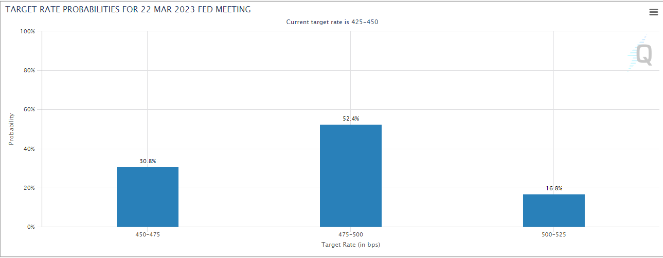 截至12月19日,CME集团的美联储观察工具显示,市场定价美联储在2月和3月选择加息25个基点的概率為52.4%。如果这种情况发生,政策利率将达到4.75-5%,略低于点阵图中的终端利率预测。在12月的会后新闻发布会上发言时,FOMC主席杰罗姆-鲍威尔承认,如果通胀数据继续走软,峰值利率可能会回落。鲍威尔指出,他们预计住房通胀将在2023年回落,但补充说,非住房服务部门的通胀,从根本上说与劳动力市场和工资有关,仍然处于令人不安的高位。最后,鲍威尔澄清说,他们没有考虑在2023年下调政策利率,并重申没有一个决策者在经济展望总结(SEP)中规定了明年的降息。