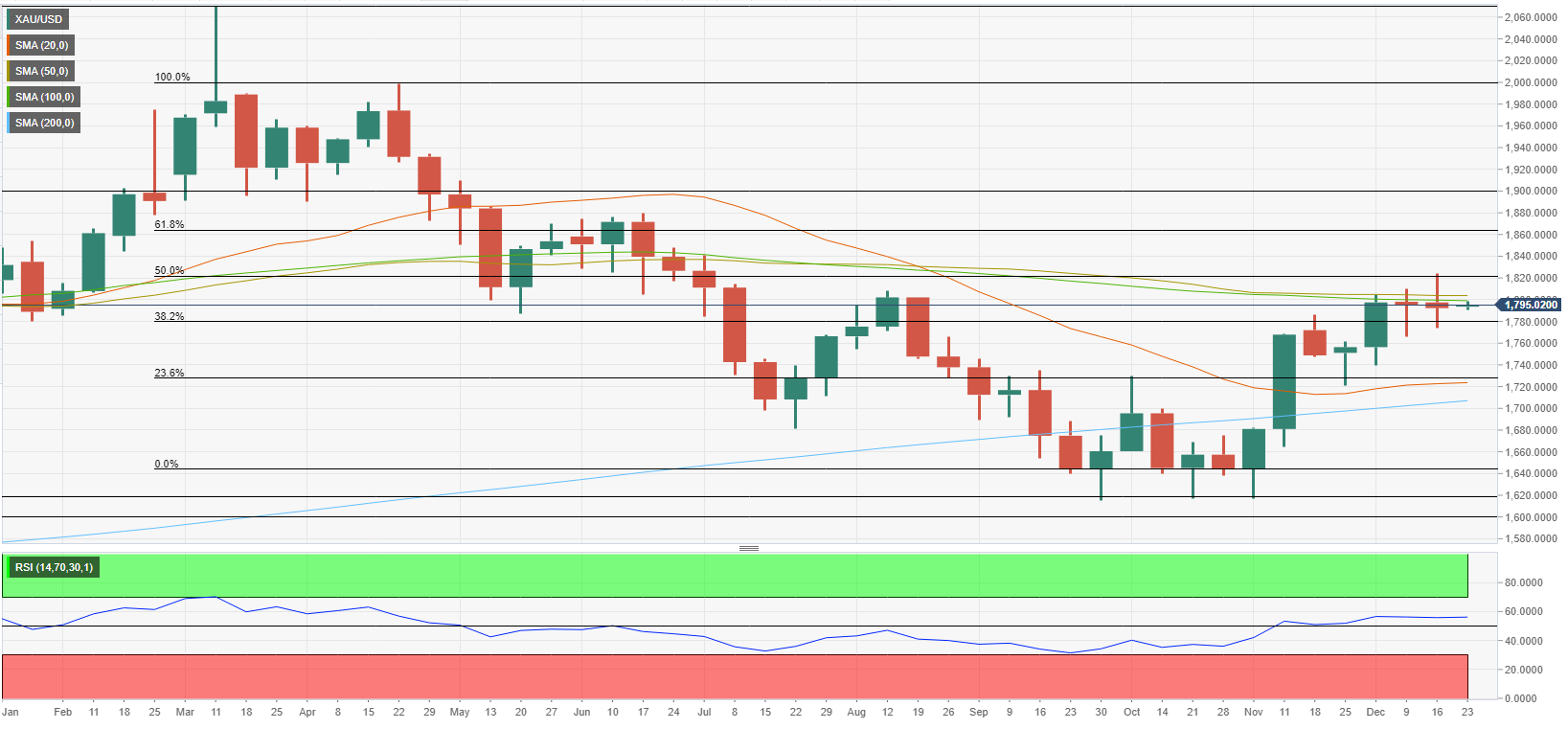 下跌方面,1780美元(38.2%的斐波回档位)构成短期支撑位。若跌破该位,金价可能进一步跌向1730美元(23.6%的斐波回档位,20周SMA)和1700美元(200周SMA)。若周缐收盘于1700美元下方,可能被视為一个重大的看跌进展,并為金价打𫔭继续跌向1640美元(跌势的终点)和1600美元(静态水平,心理水平)的大门。