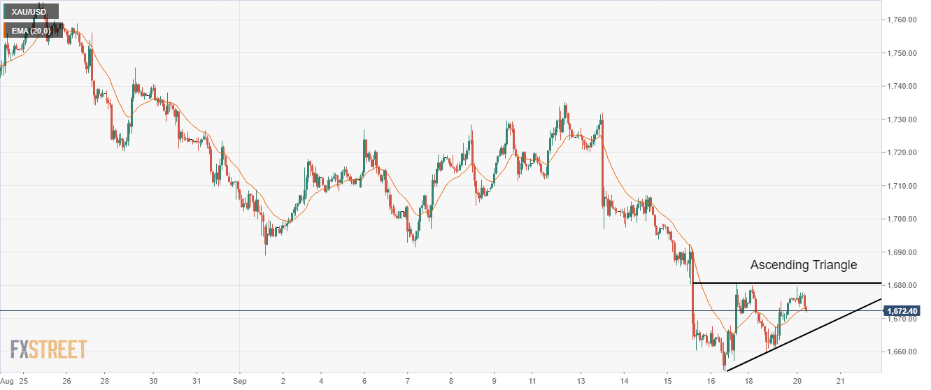 在一小时图级别上,金价在一个上升的三角形内震盪,上行趋势缐自前一周低点1,654.17美元𫔭始,而水平阻力自周五高点1,680.39美元𫔭始。