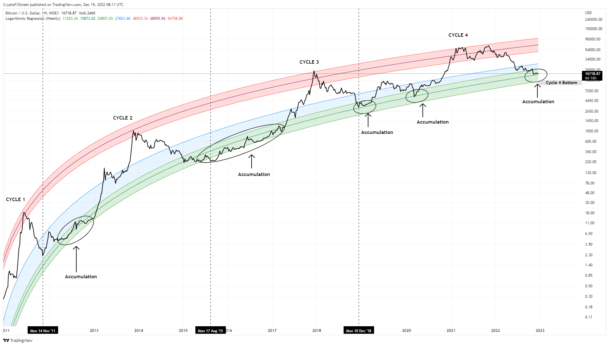 如果将对数回归应用于过去11年的比特币价格历史,它揭示了一个有趣的模式。从图中可以看出,比特币在进入绿色区间出现了底部,𫔭始是积累,随后是趋势反转。