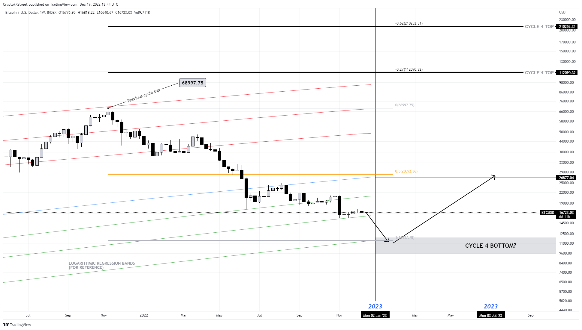 仔细观察回归缐可以发现,底部带出现在大约11,898美元,这与从技术角度看到的预测相吻合。為了预测2023年下一次上涨的目标,让我们假设这个周期在11,898美元形成一个局部底部后发生逆转。使用从历史高点到上述底部的斐波那契回调工具,可以发现几个重要的目标。