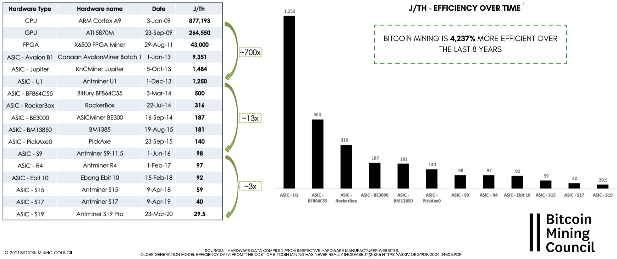 自2016年年中的S9 ASIC矿机以来,加密货币挖矿取得了爆炸性的发展。证据可以从2009年以来挖矿机的每泰拉哈希值的焦耳数改进中找到。在过去八年裡,加密货币采矿设备的效率提高了4237%。