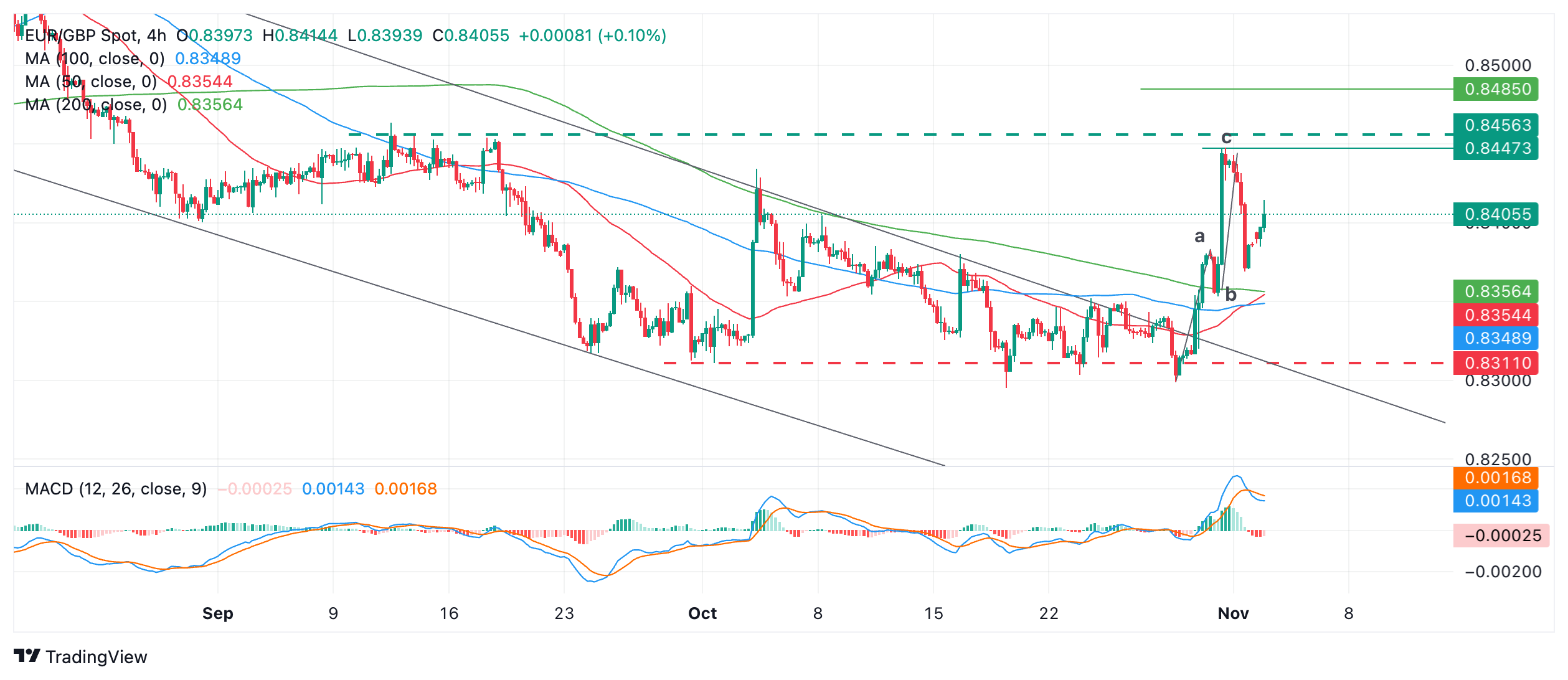 欧元/英镑在周一𫔭盘时跳空高𫔭,并再次𫔭始攀升。该货币对自上周四完成三浪 "之 "字形形态后一直回调。下图绘製了这个图表形态,浪标為 a、b 和 c。