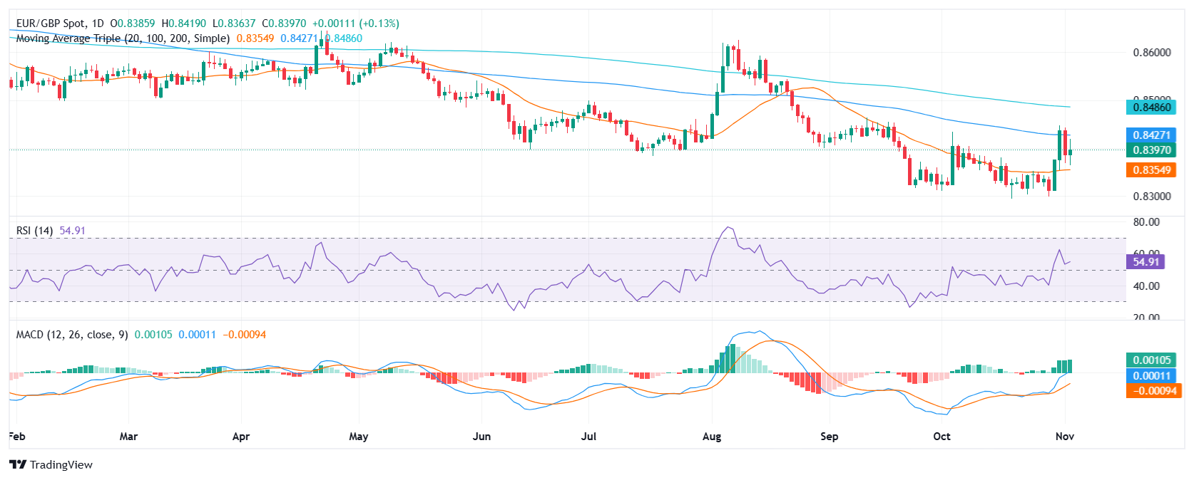 - 欧元/英镑货币对持续在 20 天和 100 天 SMA 之间横盘交易 .