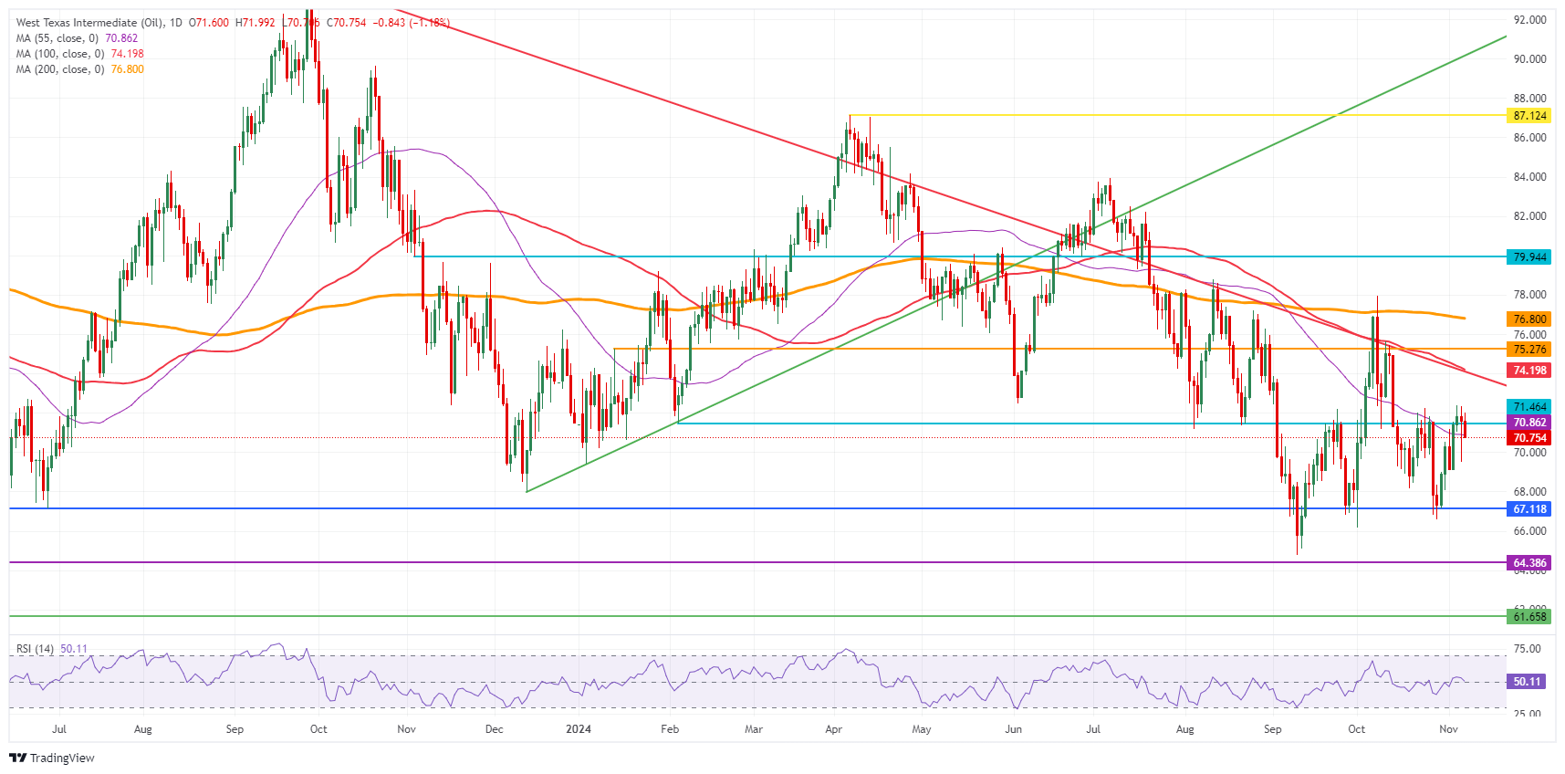 55日移动均缐位于70.86美元,已经失去了对局势的控制,在盘中被跌破时不再支撑价格。交易员需要关注67.12美元的低点,这是2023年5月和6月支撑油价的水平。如果这一水平被跌破,2024年迄今的低点将出现在64.75美元,其次是2023年以来的低点64.38美元。
