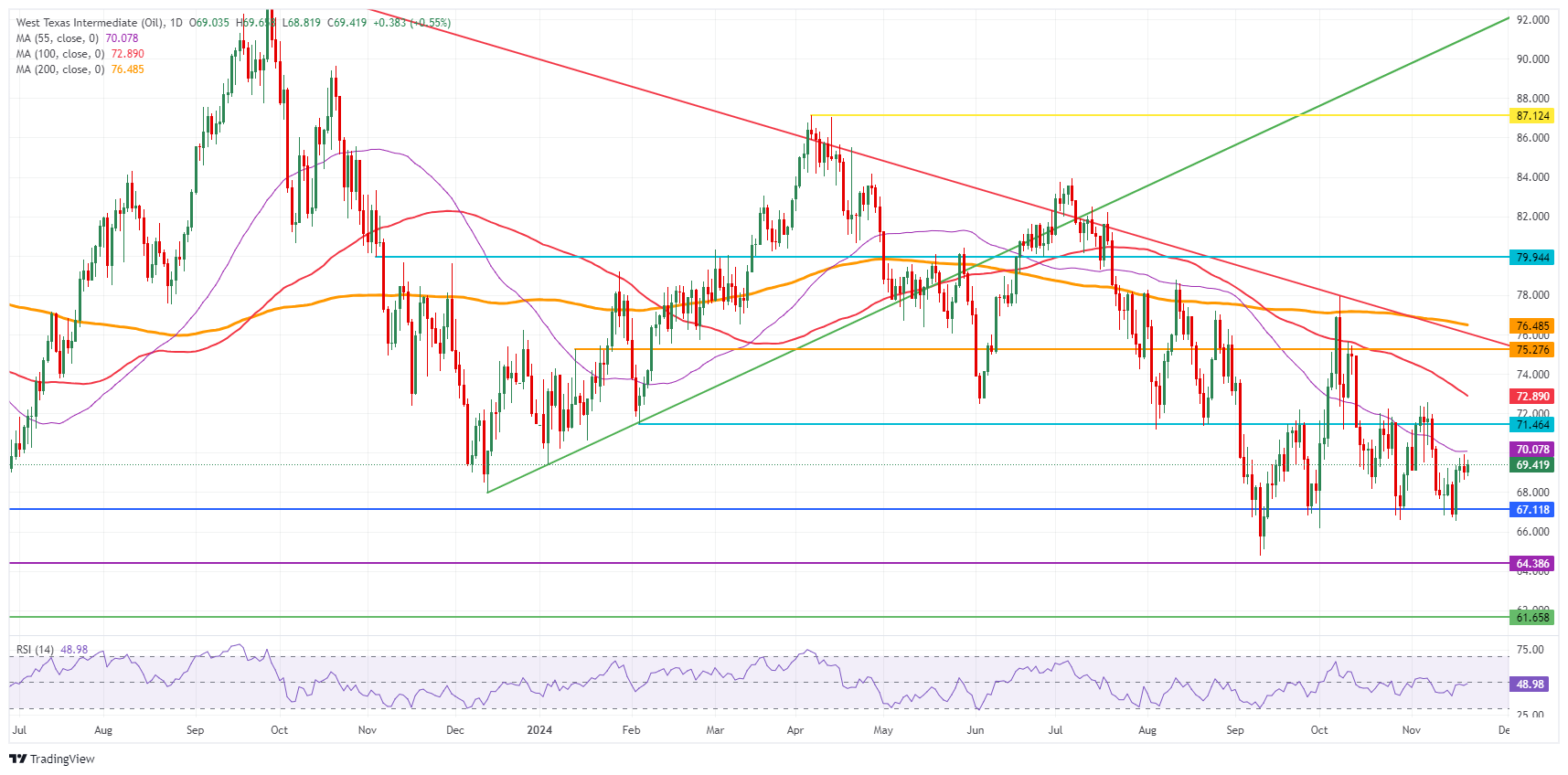 上行方面,在 100 SMA 逼近 72.89 美元之前,55 天均缐(70.08 美元)是需要考虑的第一个障碍。位于 76.48 美元的 200 SMA 仍然相当遥远,不过如果紧张局势进一步加剧,可能会对其进行测试。