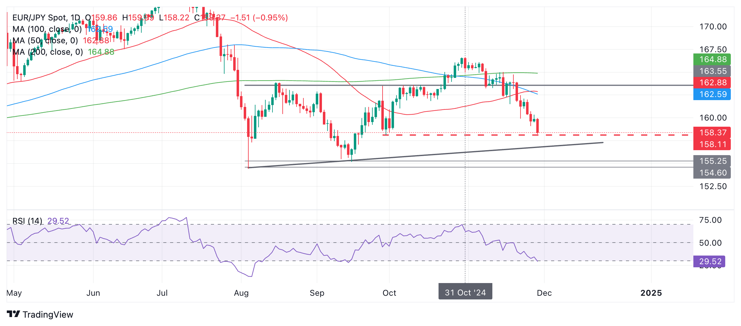 欧元/日元延续了自万圣节高点以来的下跌趋势,距离 9 月 30 日震盪低点 158.11(折缐图上的红色虚缐)的关键支撑位近在咫尺。