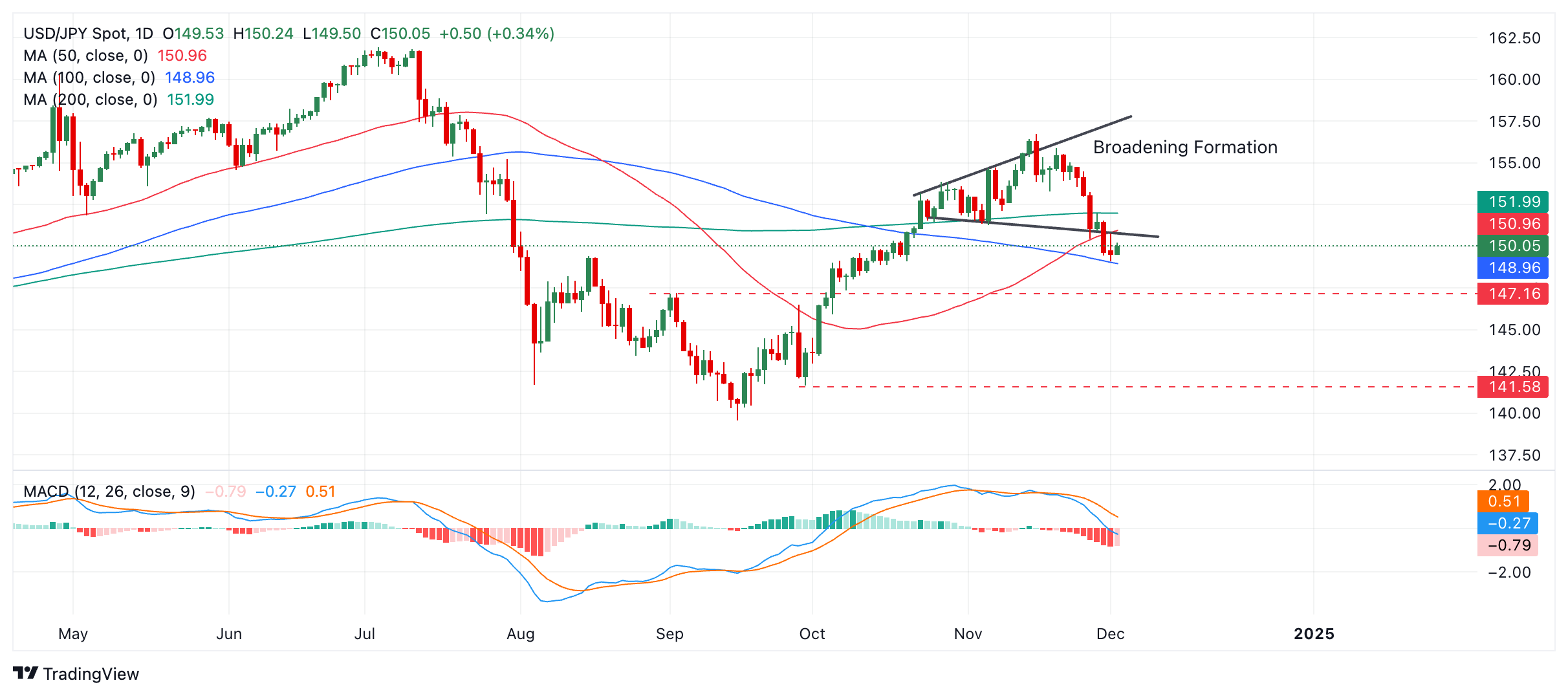 跌破 12 月 2 日低点 149.08 将确认跌势延伸至第一目标位 147.92 附近(因形态扩大而向下修正),即看跌扩大形态奇扩展位高度的 61.8% 斐波那契外推值。