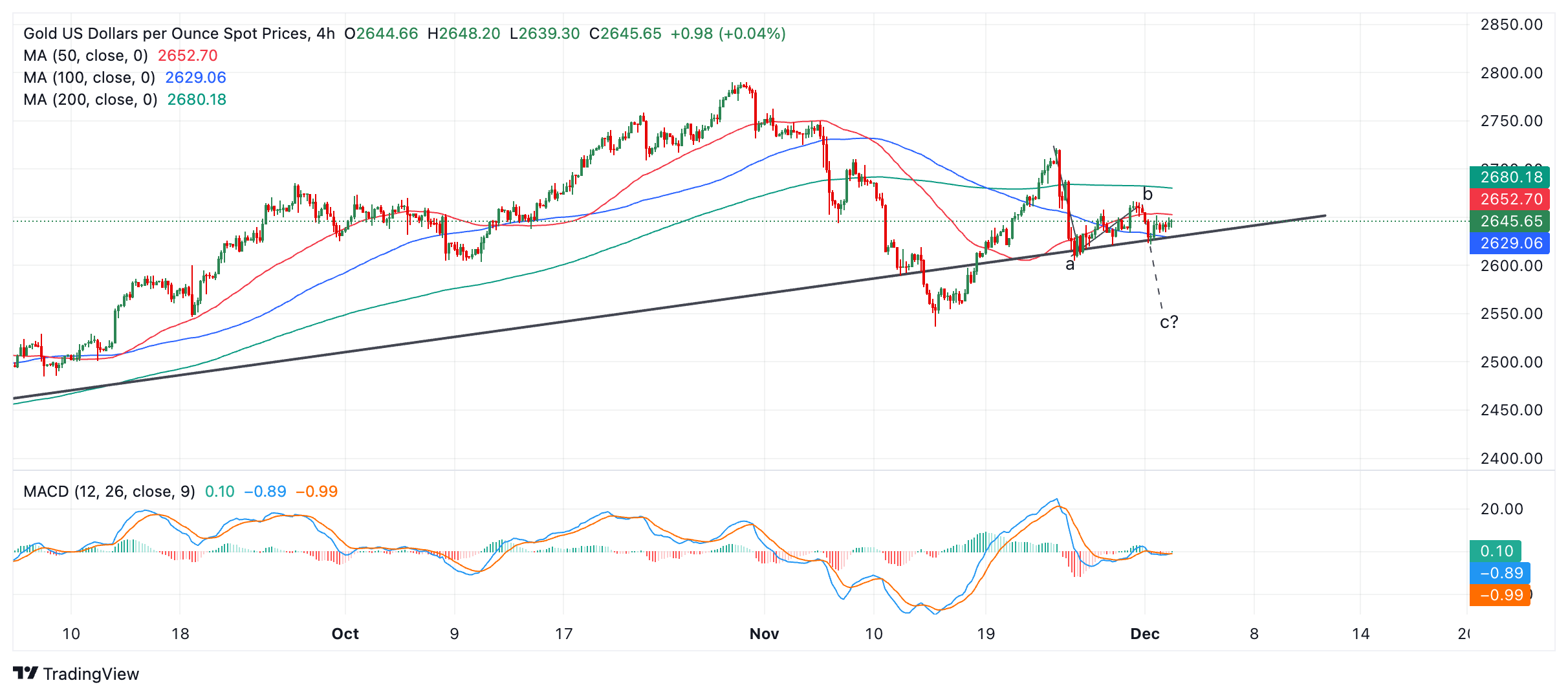 若跌破 2,605 美元(11 月 26 日低点),则将确认向 c 浪末端目标 2,550 美元附近的后续下跌。