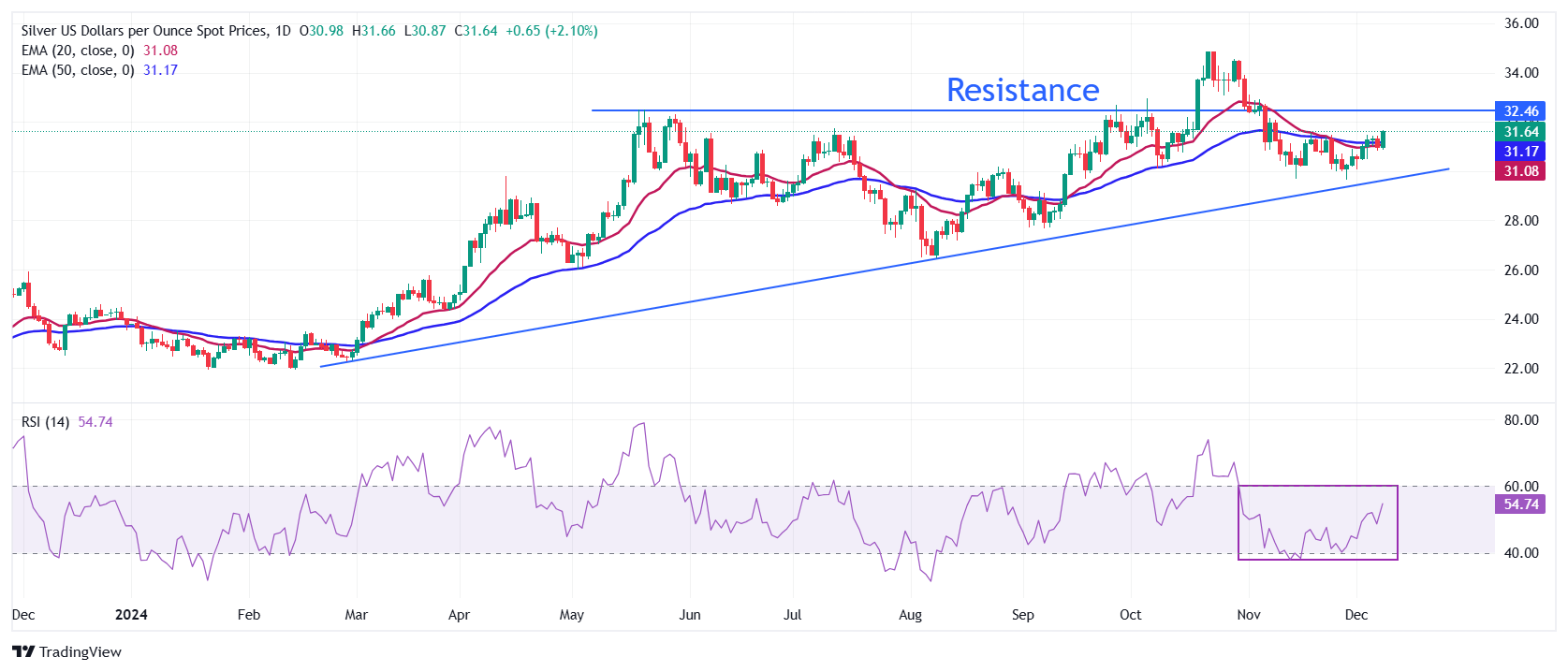 本周伊始,白银价格(XAG/USD)飙升至 31.50 美元上方。由于金融市场参与者对美联储(Fed)将在12月18日的政策会议上降息25个基点至4.25%-4.50%越来越有信心,白色金属走强。