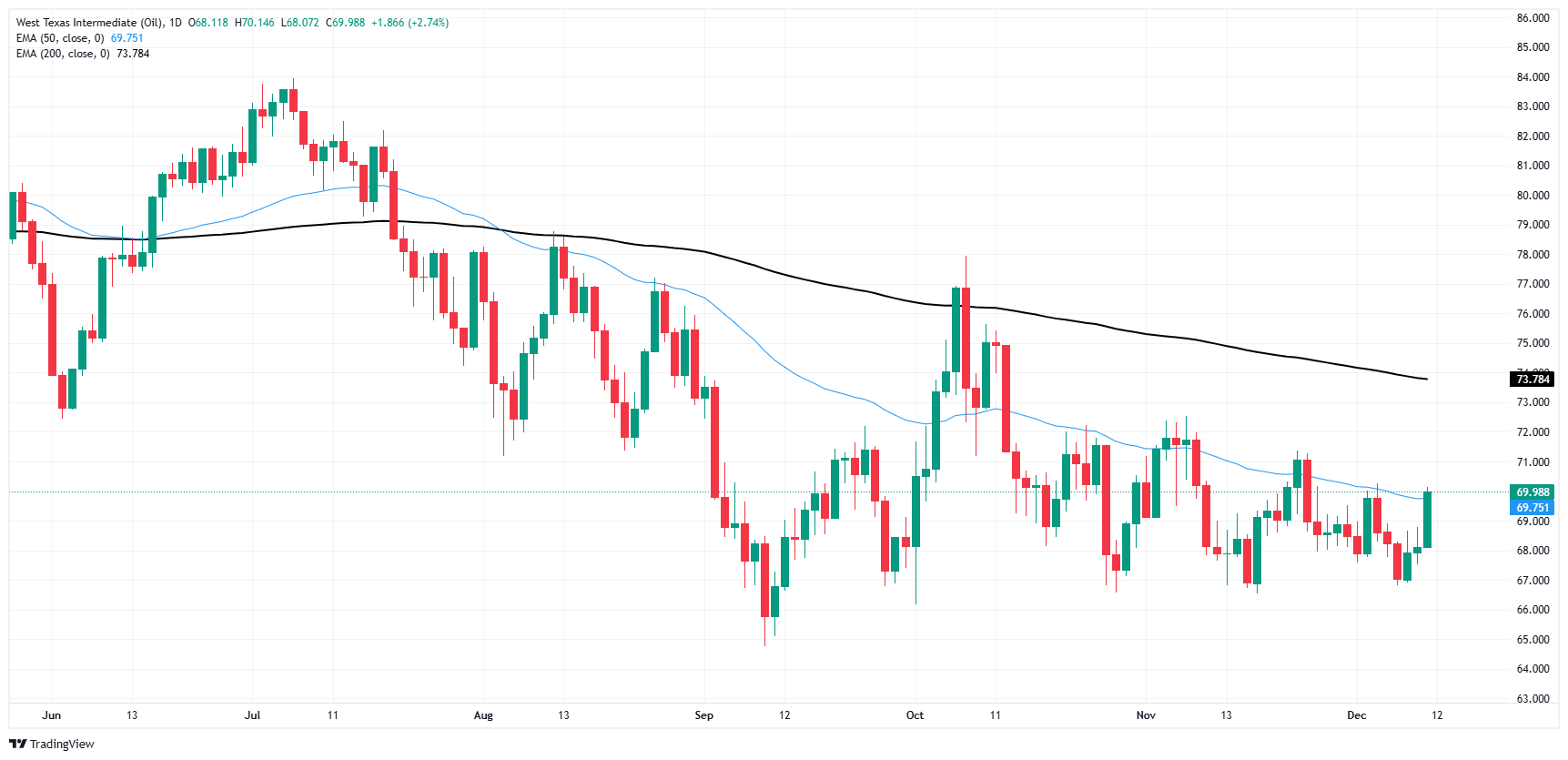 自 9 月份跌破每桶 66 美元以来,原油价格一直在一个总体下行楔形形态当中。WTI油价即便 68 美元下方获得支撑,但一直未能明确跌破 50 日指数移动均缐(EMA),盘中价格走势有望在短期内继续与均缐展𫔭争夺。