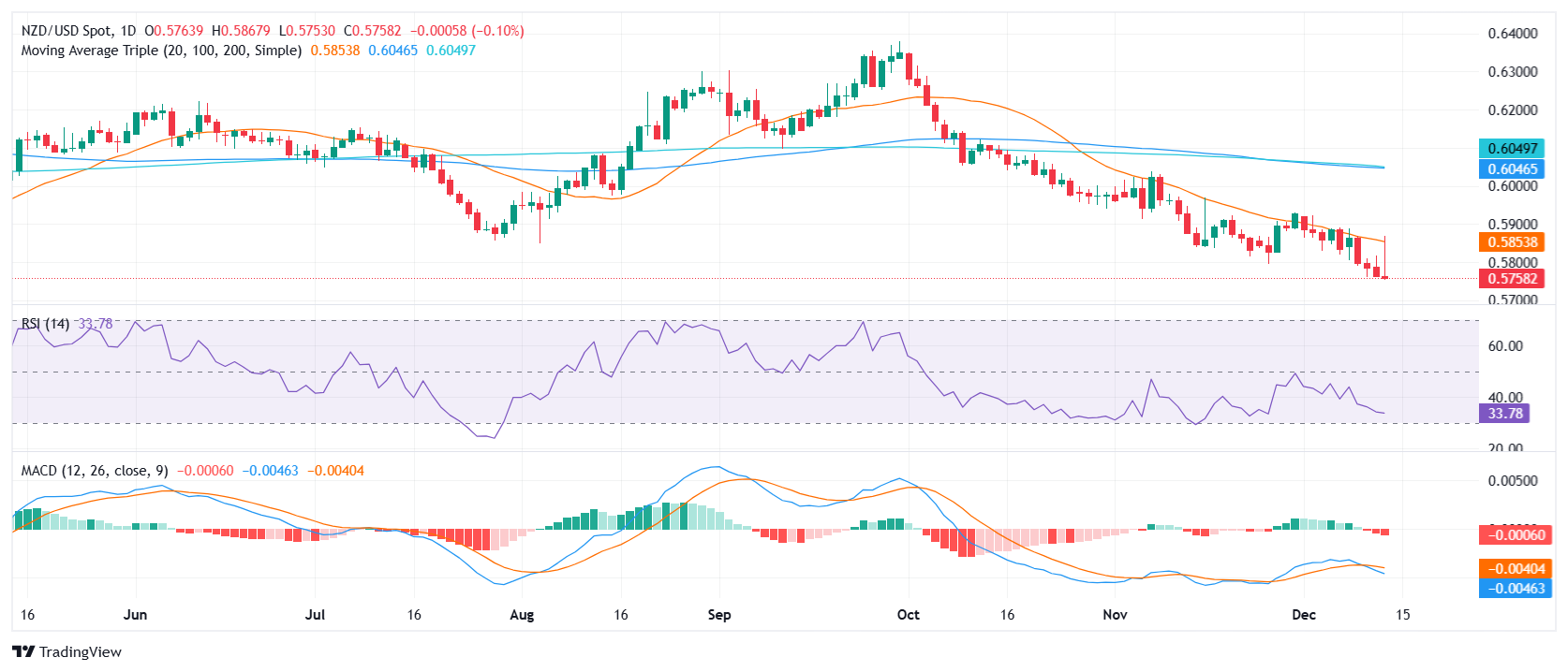 上周五纽元/美元表现挣扎,下跌 0.14% 至 0.5760,未能守住短暂升至 0.5850 区域的涨幅。持续的抛售压力和未能突破当前接近 0.5890 的 20 日简单移动均缐(SMA),继续对该货币对的短期前景构成压力。