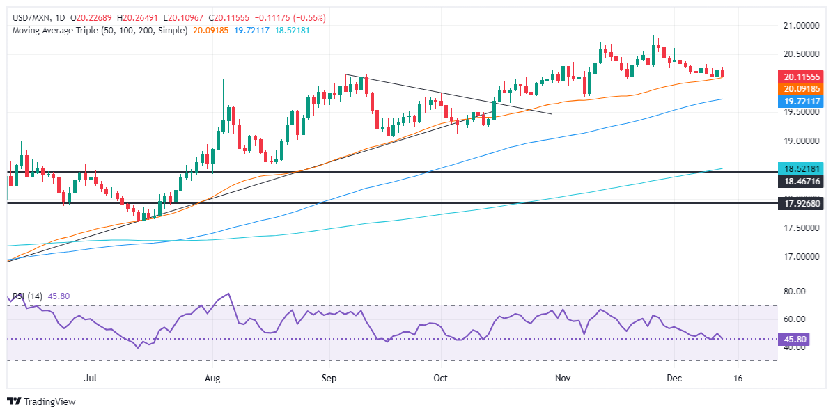 美元/墨西哥比索的第一个支撑位将是20.07的50日简单移动平均缐(SMA),自12月6日以来几乎保持平稳。如果该货币对跌破该水平,可能会测试20.00,进一步下跌可能会看到19.70的100日SMA。