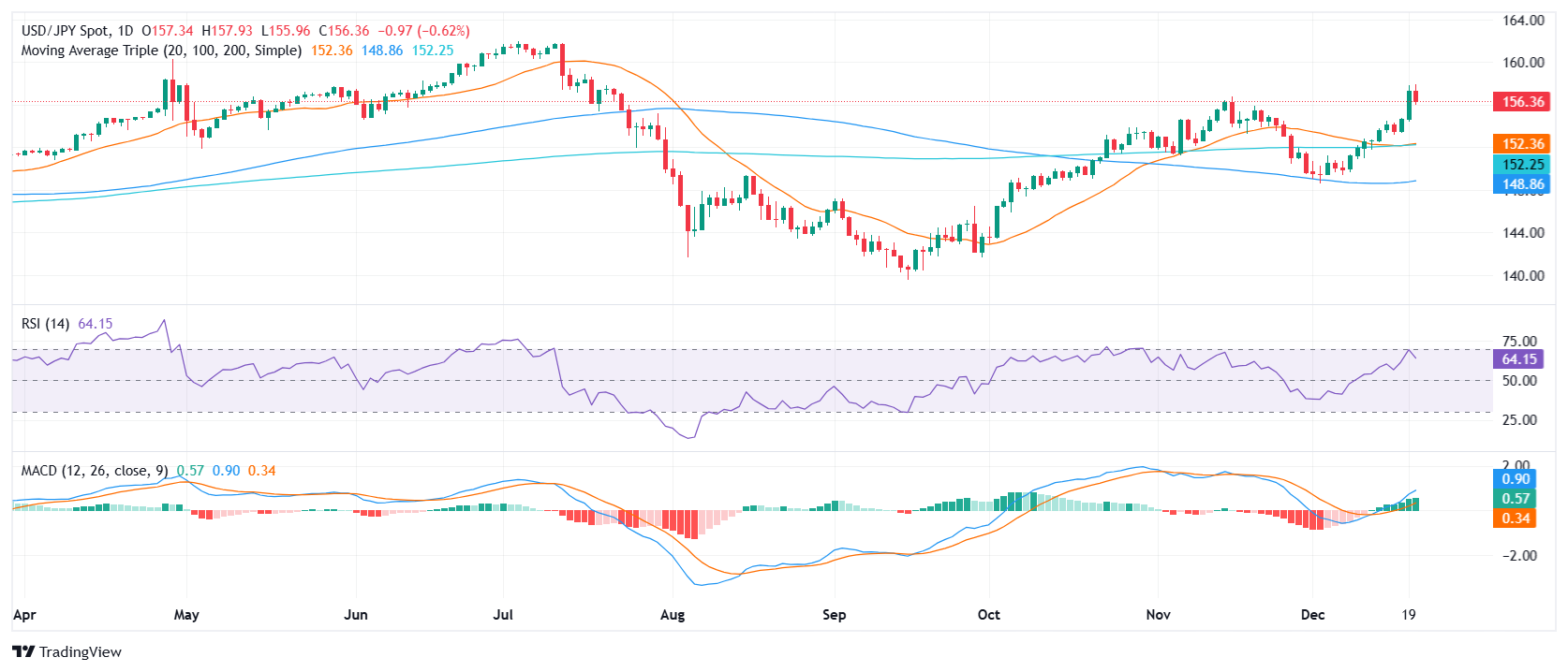 美元/日元回落至156.50,显示出看涨动能的冷却,关键技术指标显示出混合状况。相对强弱指数(RSI)在超𧹒阈值70处被拒绝,表明上升趋势可能耗尽。同时,移动平均趋同/背离(MACD)柱状图继续打印上升的绿色柱,反映出持续的看涨动能。