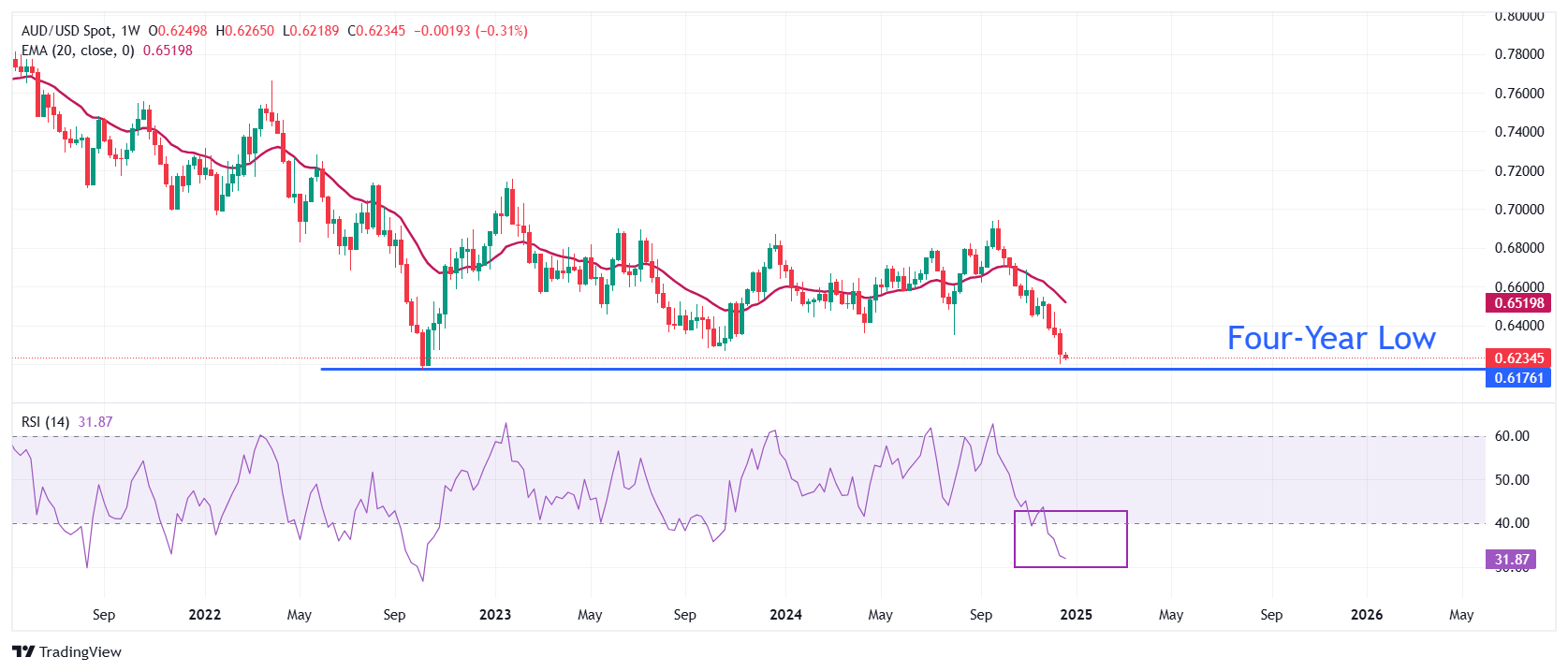 澳元/美元交投略高于四年低点 0.6180。不过,澳元对的前景看跌,因為 20 周指数移动平均缐 (EMA) 位于0.6520附近,且正在向下倾斜。