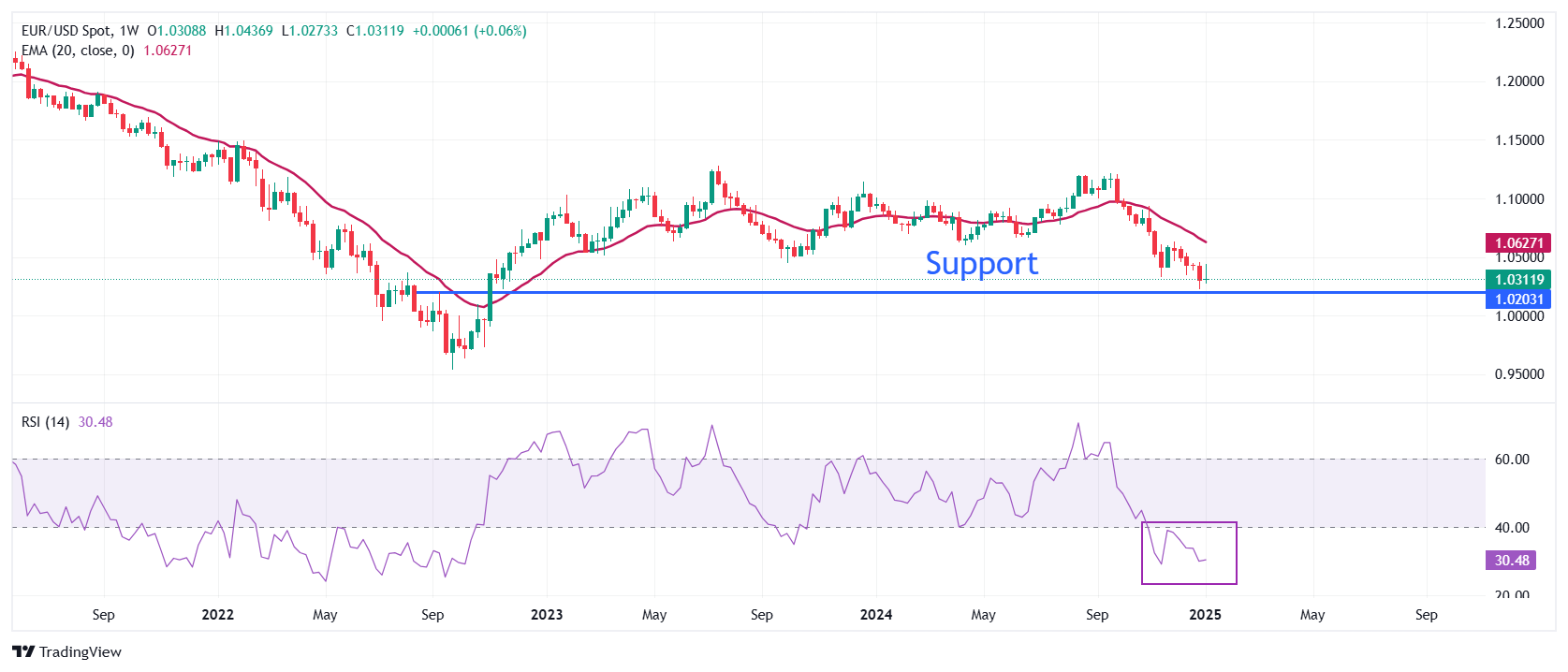 欧元/美元在周缐图上接近2022年9月高点1.0200的关键支撑位。货币对的前景总体看跌,因為20周指数移动平均缐(EMA)在1.0627处下滑。