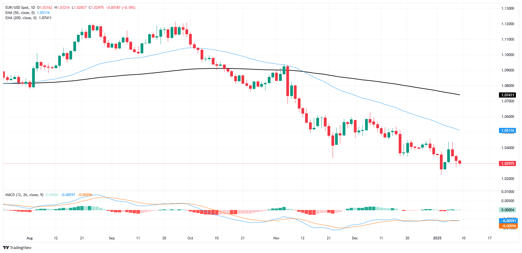 周四,欧元/美元进一步进入看跌区域,下跌了微不足道但持续的0.1%,并将𧹒盘限制在1.0300关口附近,货币对在26个月低点附近徘徊。