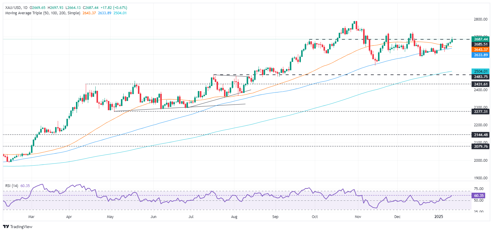 黄金的上升趋势依然存在,黄色金属连续创下更高的高点和低点,交易员瞄准2700美元。相对强弱指数(RSI)指标显示,多头占据主导地位,动能强劲倾向于上行。