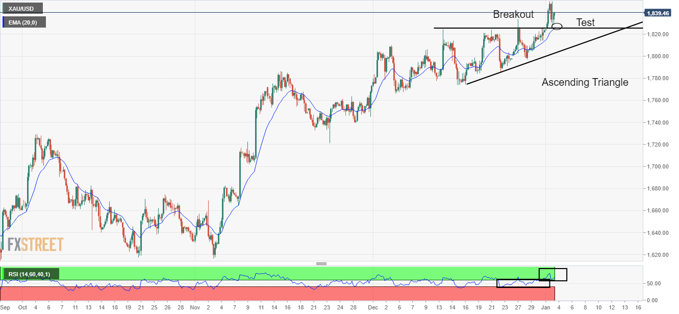 继突破上升三角形形态后,金价已出现反转,测试12月13日高点1,825.55美元附近以来形态的水平阻力寻求突破。 20周期指数移动均缐(EMA)在1,825.00美元附近,构成金价强支撑。