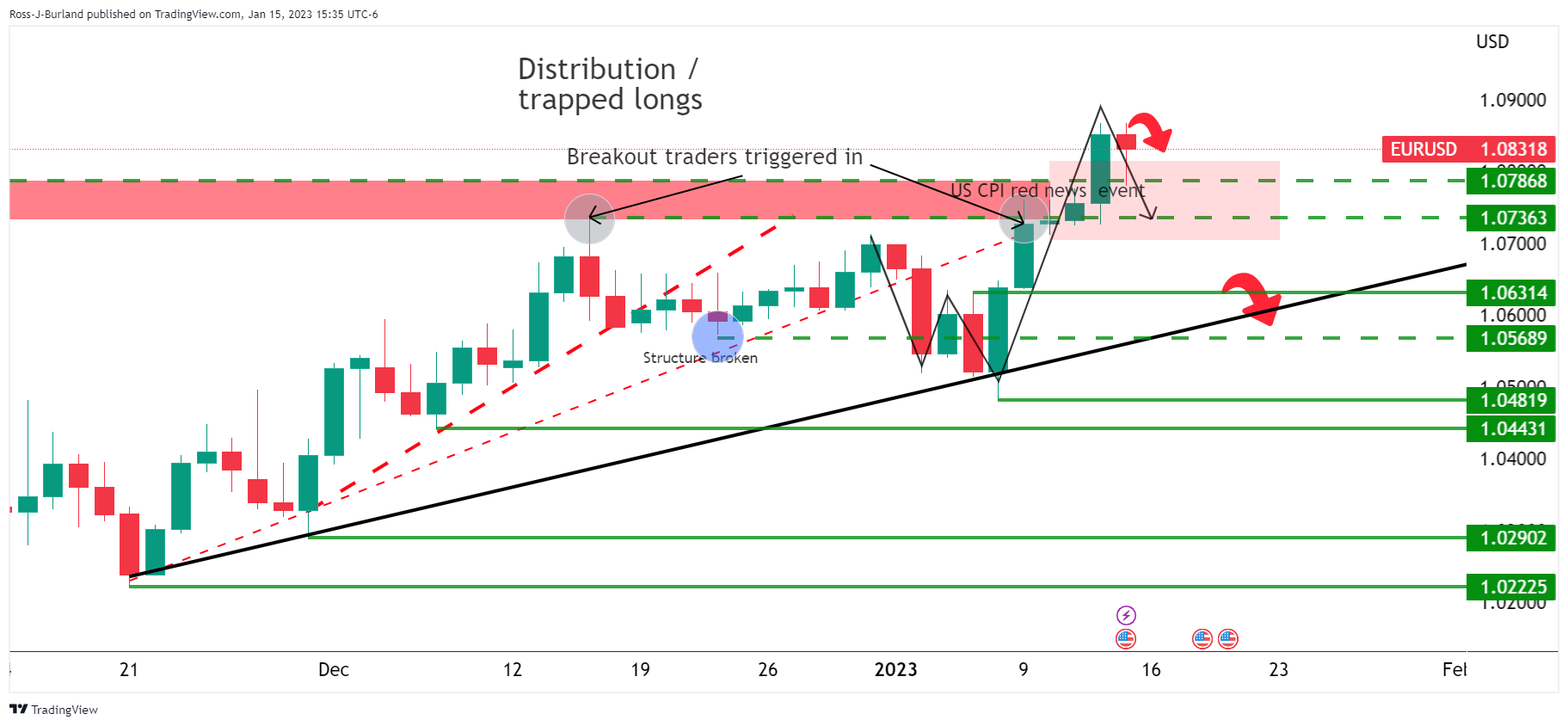 按照前期分析,欧元/美元价格分析:多头可能会进入陷阱,有人解释说,押注突破的交易者在消费者价格指数事件之前得到触发,介入市场。然而,美国通胀引发欧元/美元反弹突破1.0800,并可能在1.0850区间内触发止损位。继美国通胀公布后的技术分析,这為后市欧元/美元反转打𫔭空间,欧元/美元刷新看涨周期高点,有望展𫔭為期5天的反弹。