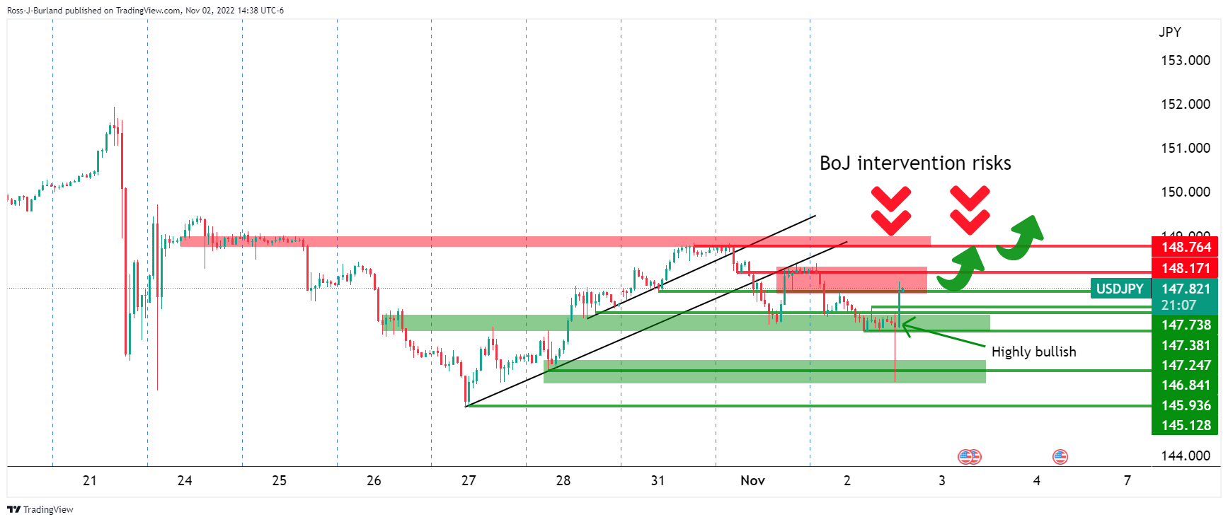 重磅事件美联储决议且金融市场随之波动后,周三美元/日元多头回归。美元/日元最初下跌,测试低位145.66,然后反弹,收复所有跌幅,并在美国时段上涨,录得美联储决议后的高位147.89。