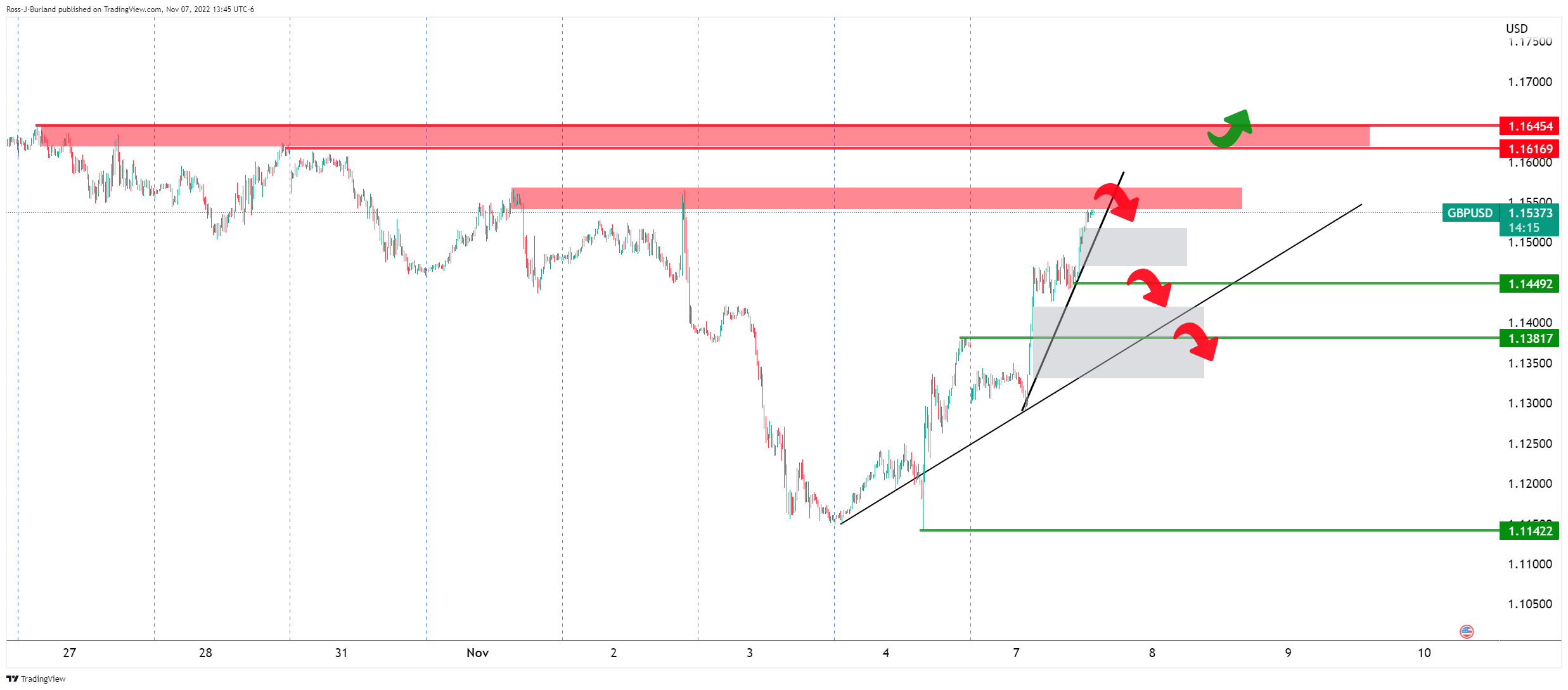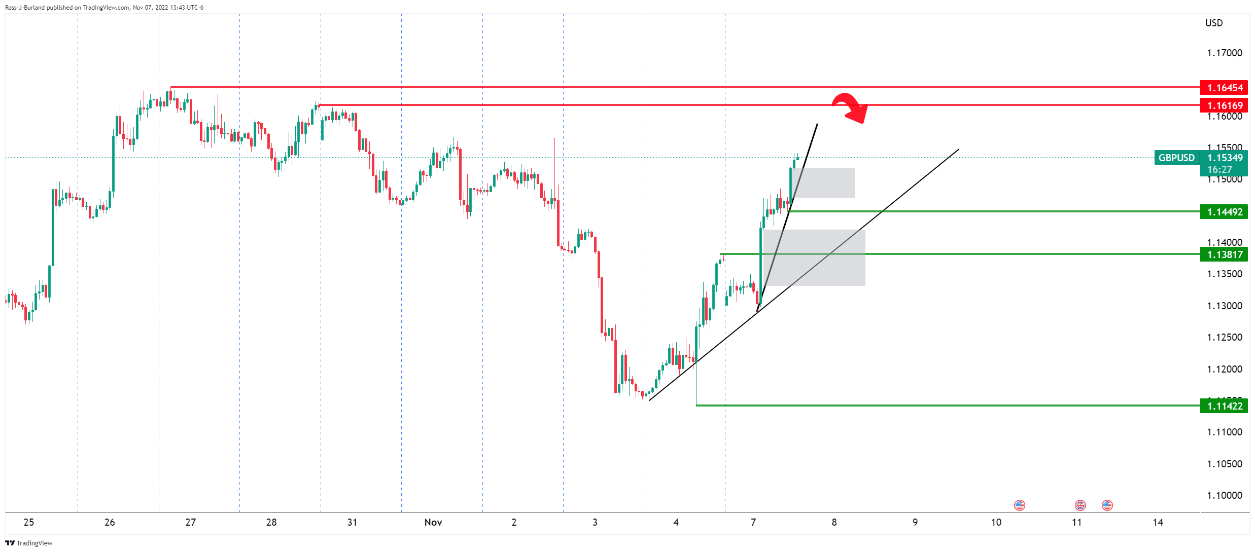 小时图显示,英镑兑美元坚定上涨,指向上周高点,然后是上个月高点1.1616区域,然后是1.1645。